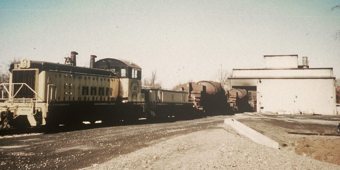 Vintage train beside industrial building