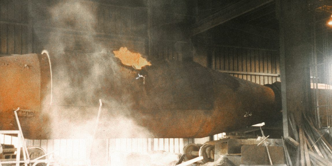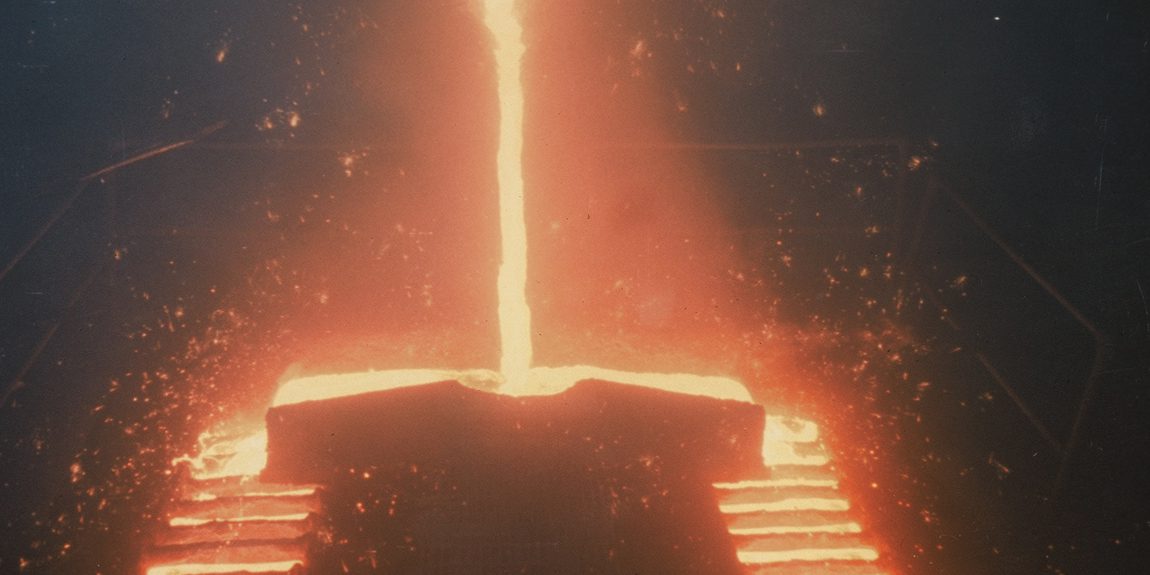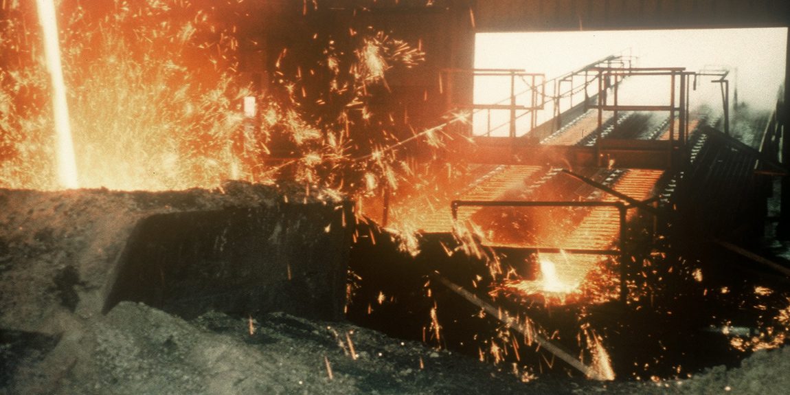 Glowing molten metal in industrial setting