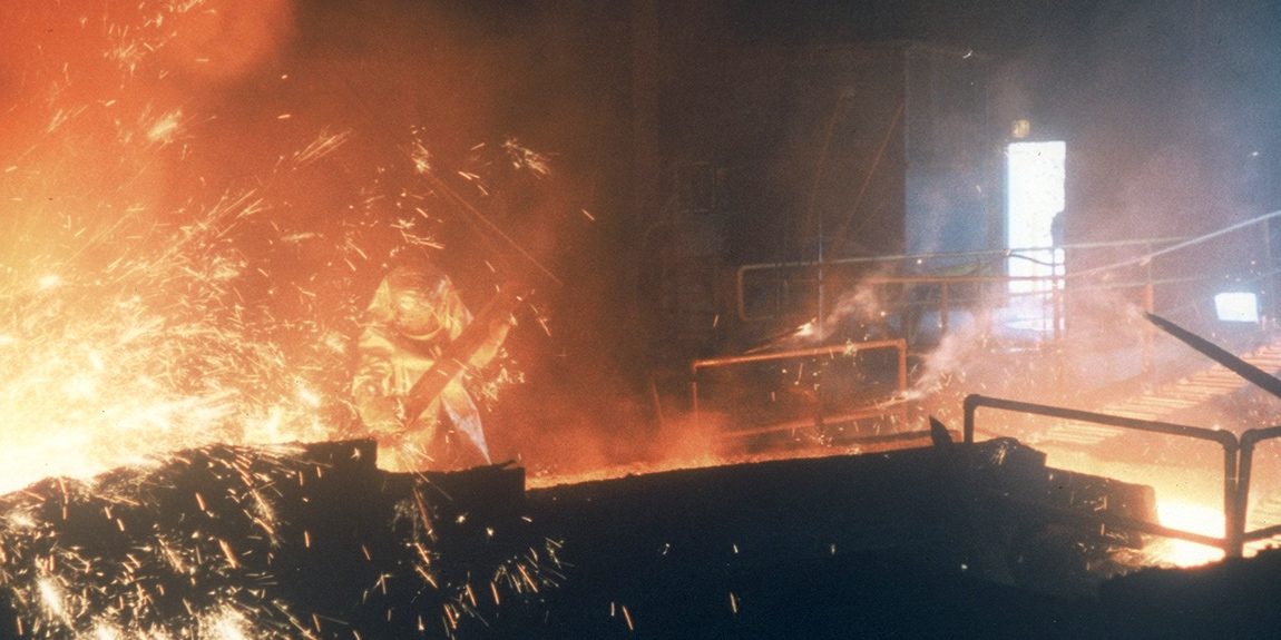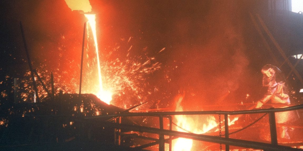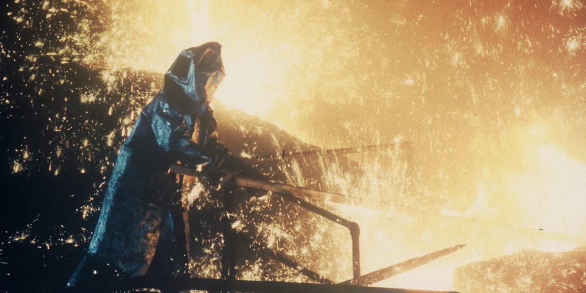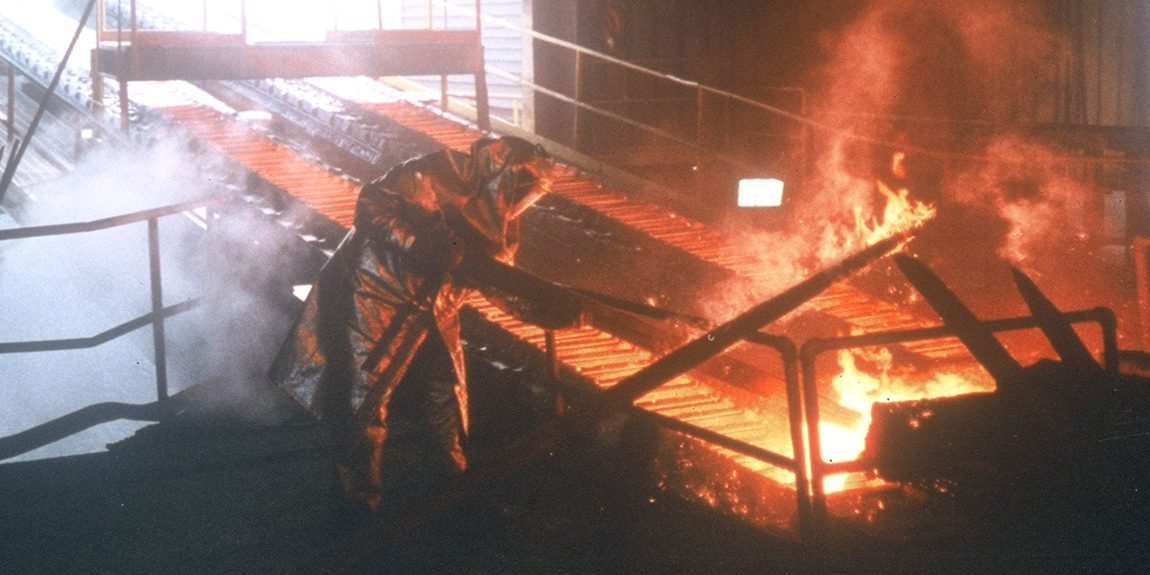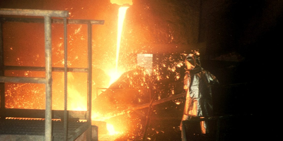 Worker in protective gear near molten metal