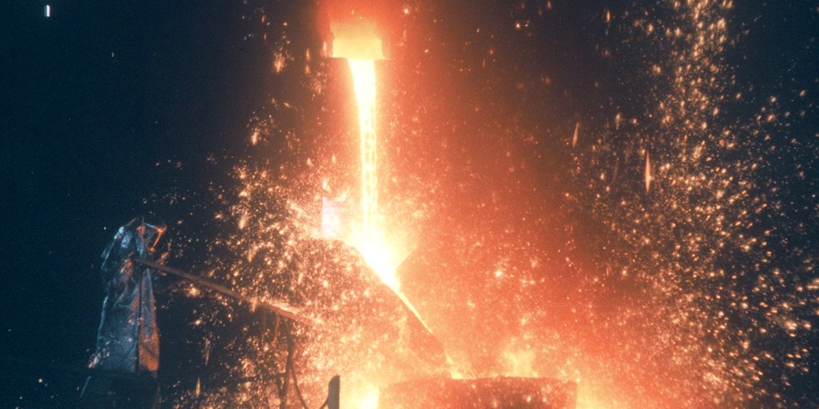 Intense foundry scene with glowing metal