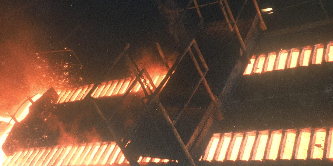 Hot metal slabs in production line