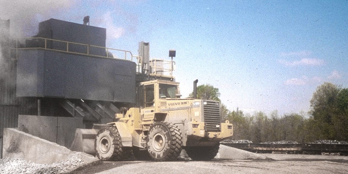 Heavy machinery near a factory